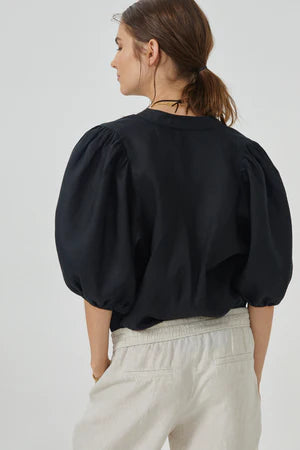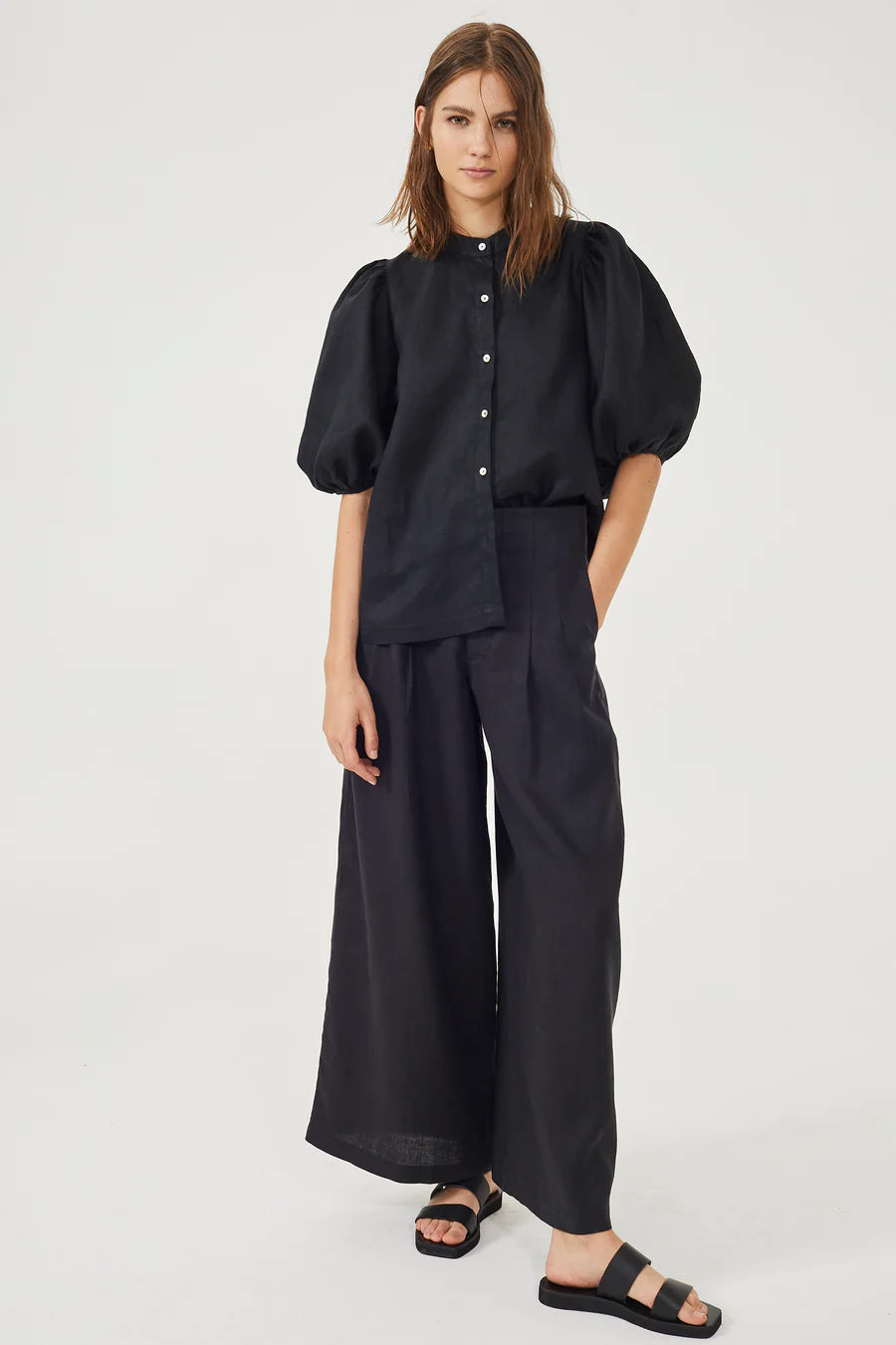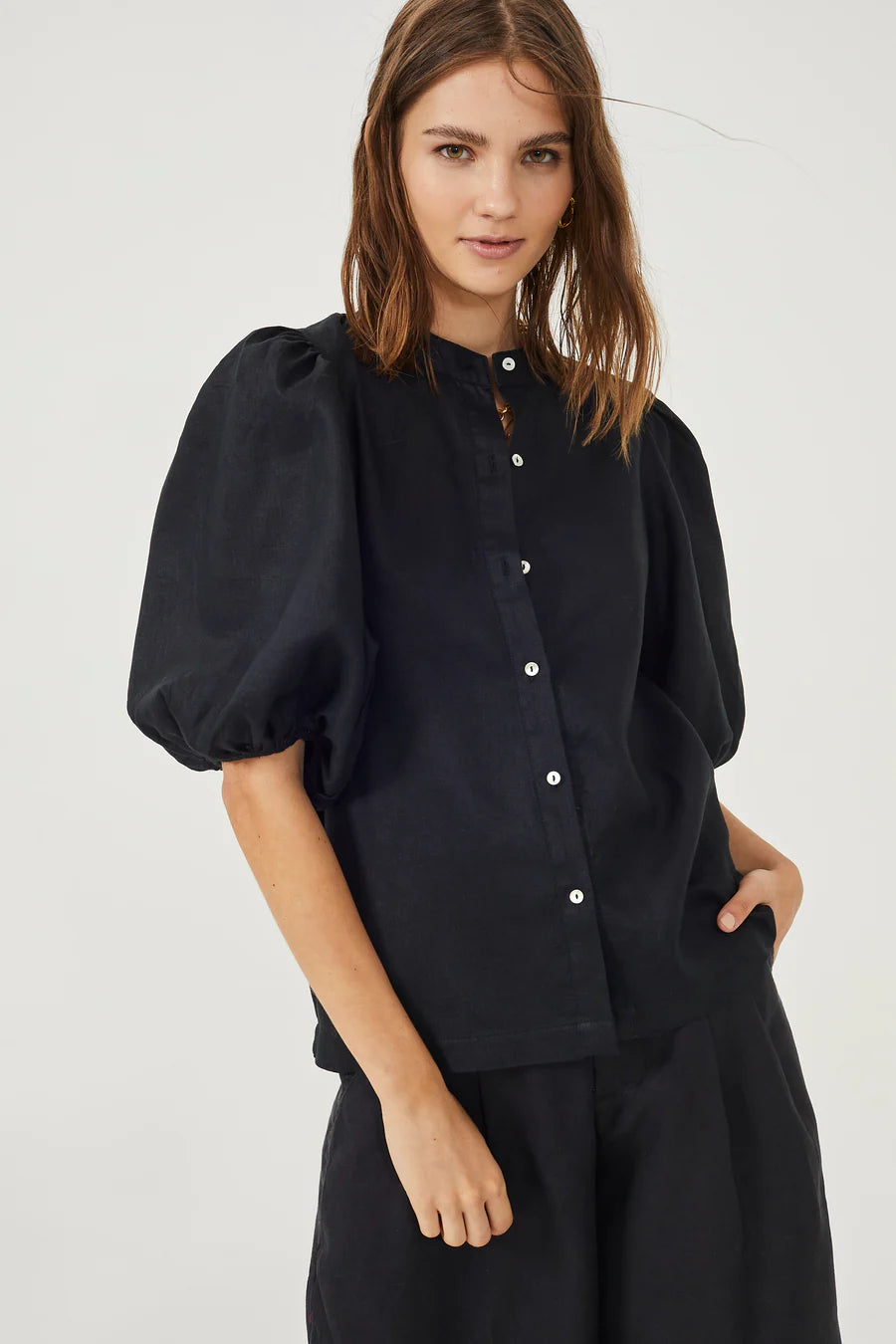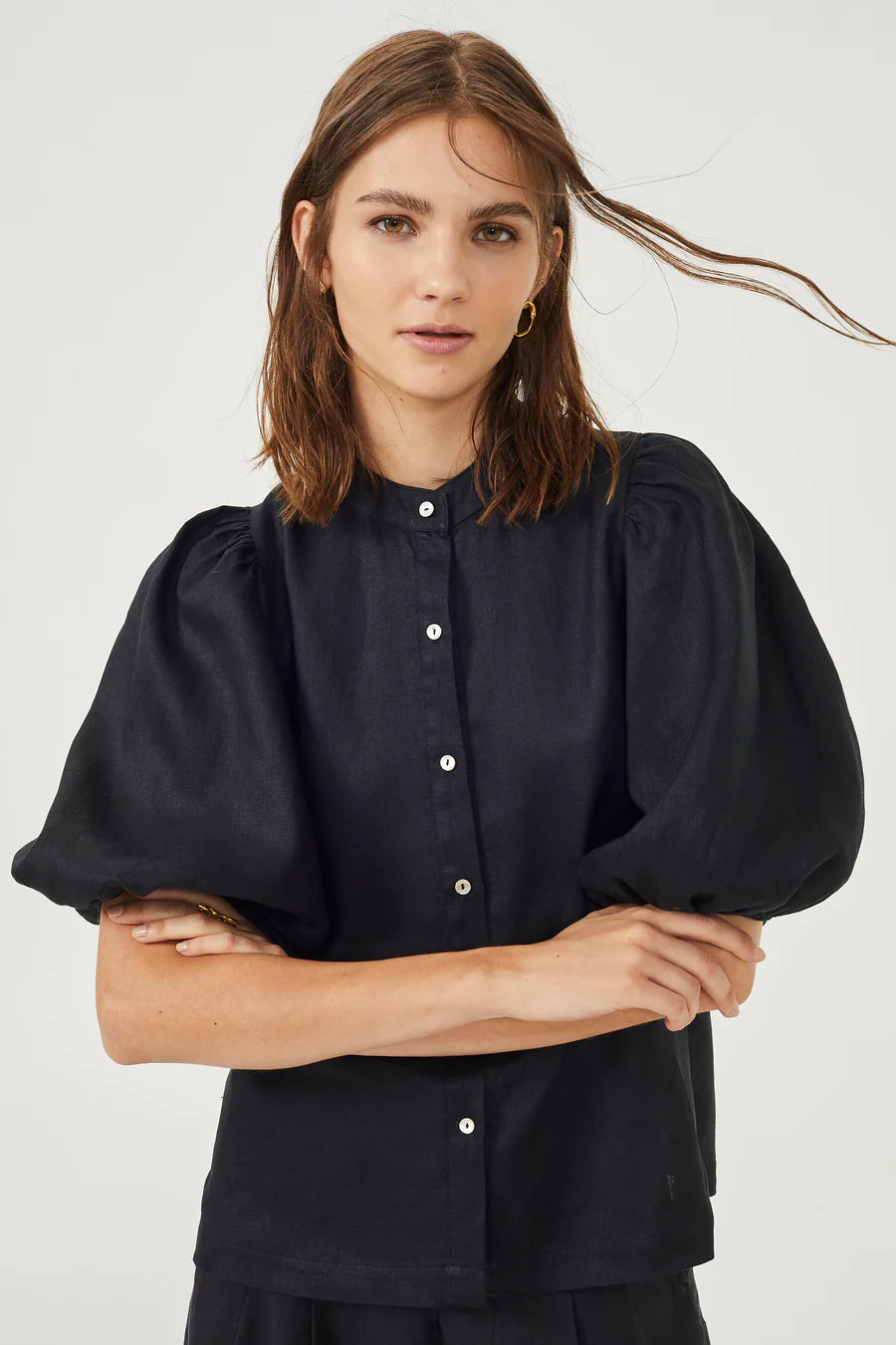 The Bubble linen top is a very feminine and flattering piece for any occasion. Features a mao neckline, button front closure, and puff sleeves. Paired it with the Luna pant, Elastic shorts, or your favorite jeans.