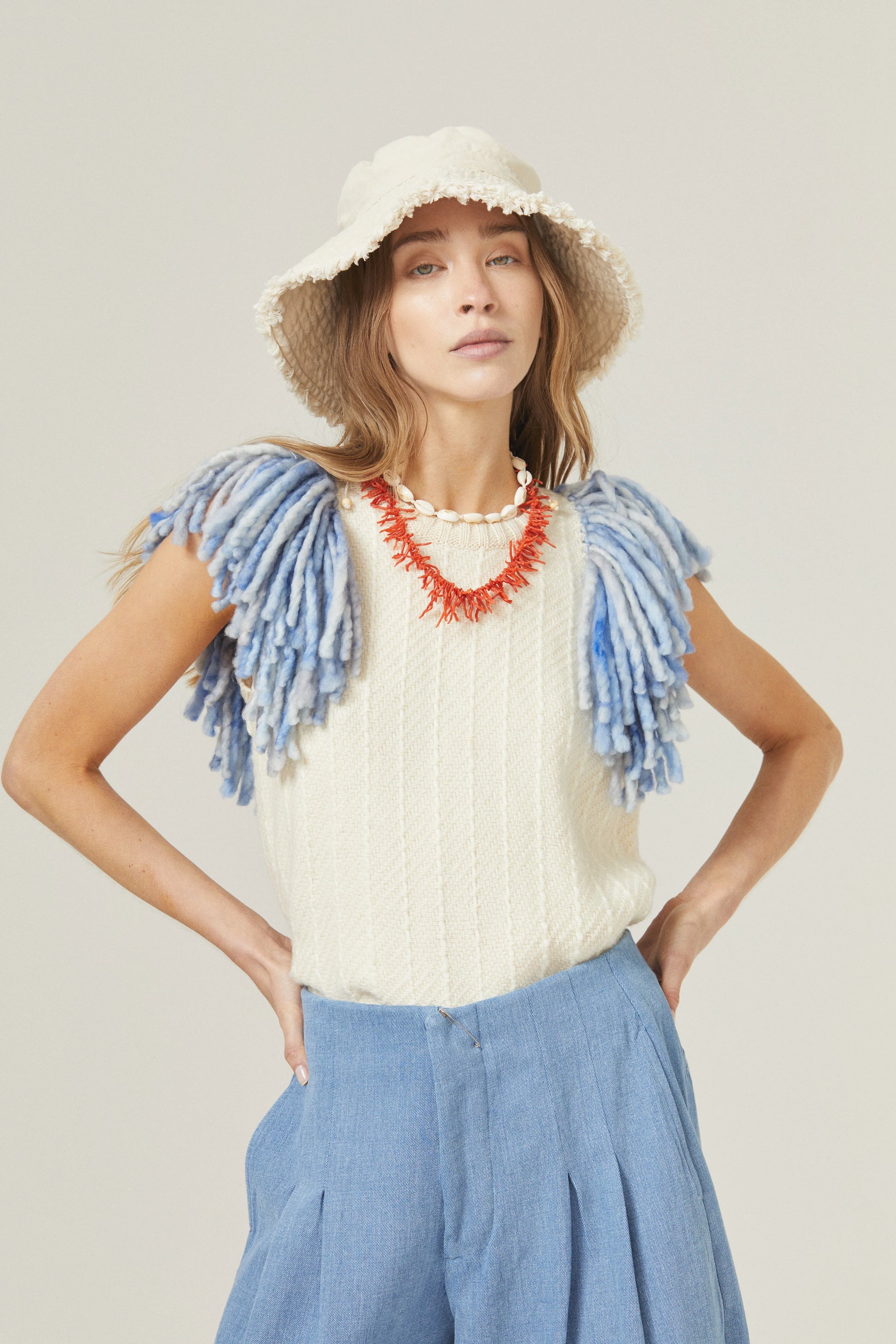 MERINO WOOL VEST - NATURAL WITH LIGHT BLUE FRINGES