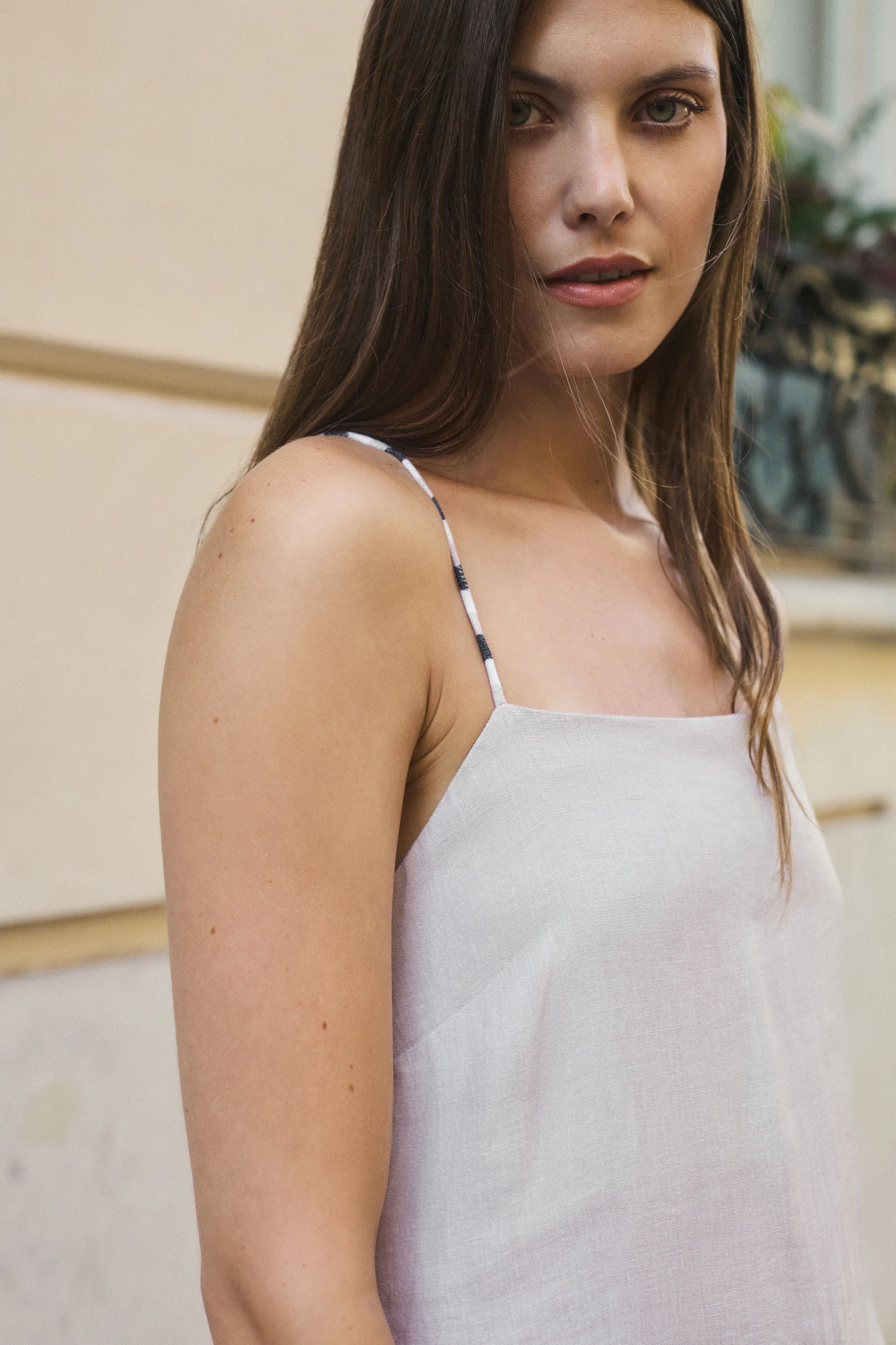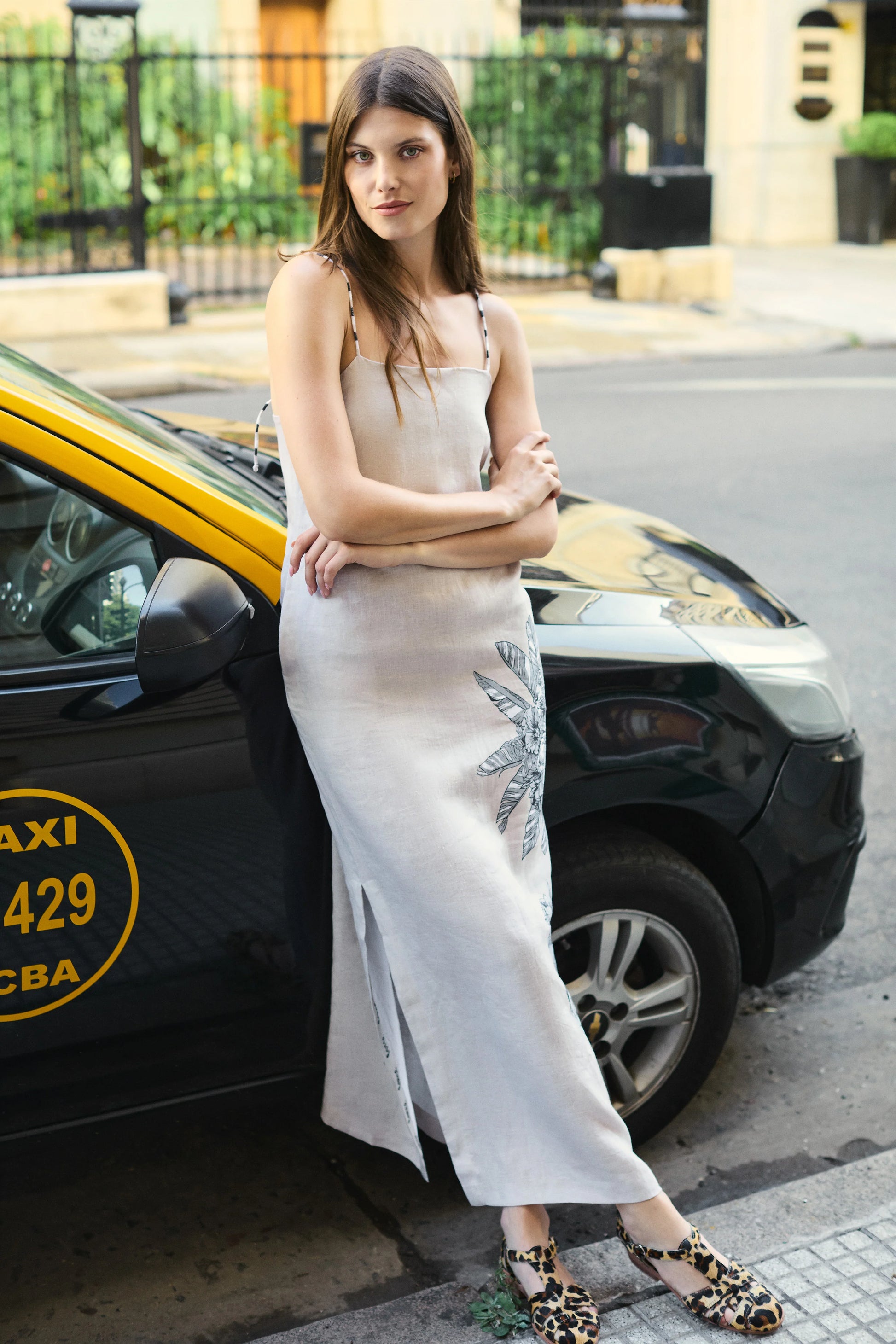 A midi linen dress with adjustable fine straps woven in neutral-colored threads. It has side slits with internal appliqués that repeatedly say force. Made from 100% beige linen, it features tiger faces, palm leaves, and flowers along the left side. A concealed side zipper completes the design at the back
