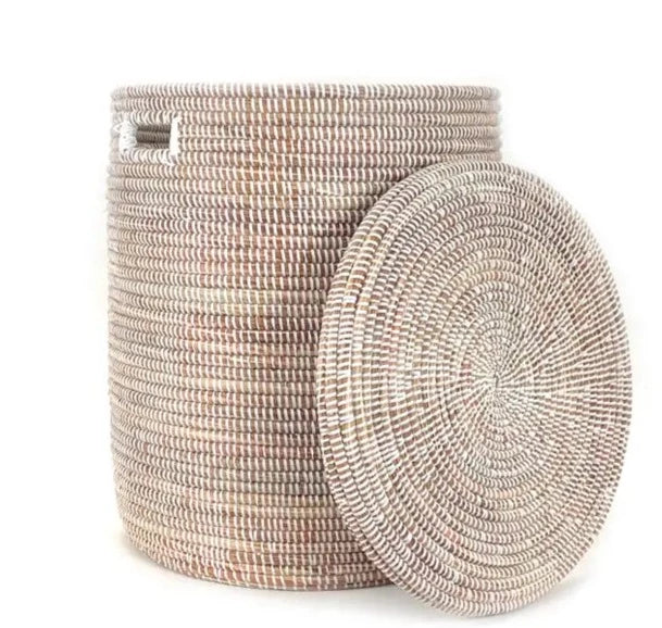 This versatile African basket adds a touch of hand made global decor to any room. A perfect storage container, it has both practical functionality and contemporary style. This basket looks great as a contrast to our two-tone baskets as a focal point in any room. Wolof women in rural Senegal weave these baskets from millet grass, and colorful plastic threads which add strength and durability.
