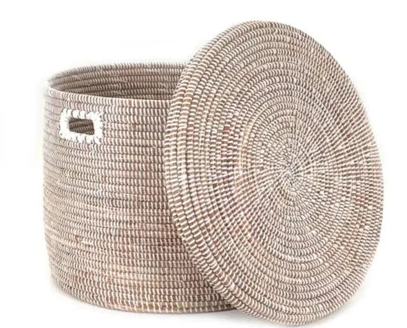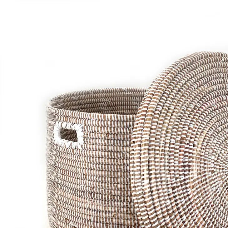 This versatile African basket adds a touch of hand made global decor to any room. A perfect storage container, it has both practical functionality and contemporary style. This basket looks great as a contrast to our two-tone baskets as a focal point in any room. Wolof women in rural Senegal weave these baskets from millet grass, and colorful plastic threads which add strength and durability.
