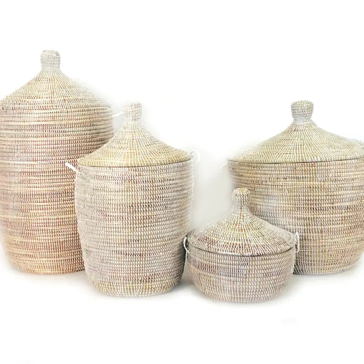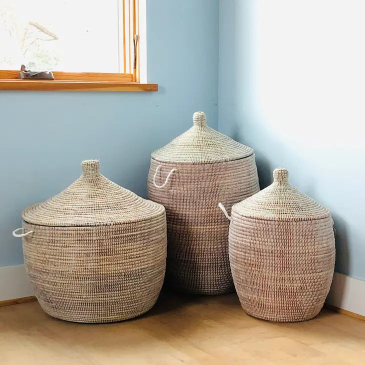 This versatile African basket adds a touch of hand made global decor to any room. A perfect storage container, it has both practical functionality and contemporary style. This basket looks great with the other two-tone baskets in the set as a focal point in any room. Wolof women in rural Senegal weave these baskets from millet grass, and colorful plastic threads which add strength and durability.