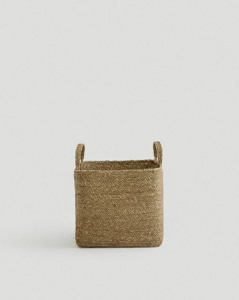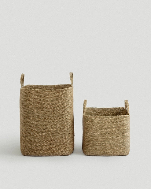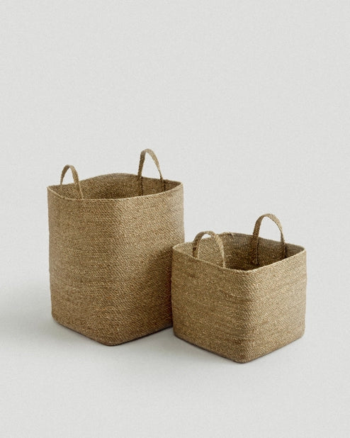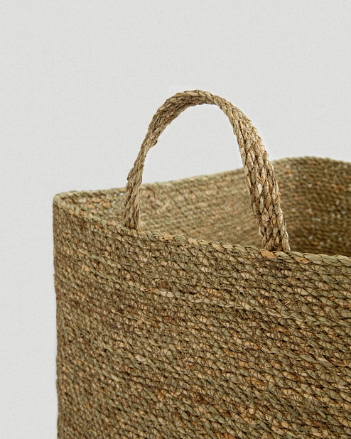 A collection of handcrafted sewn baskets with a clean, minimalist aesthetic, made from sustainable seagrass. Natural seagrass is a sustainably harvested vegan material BSCI Certified