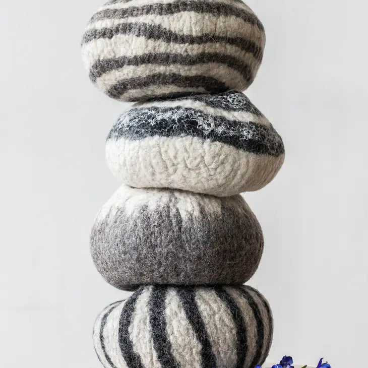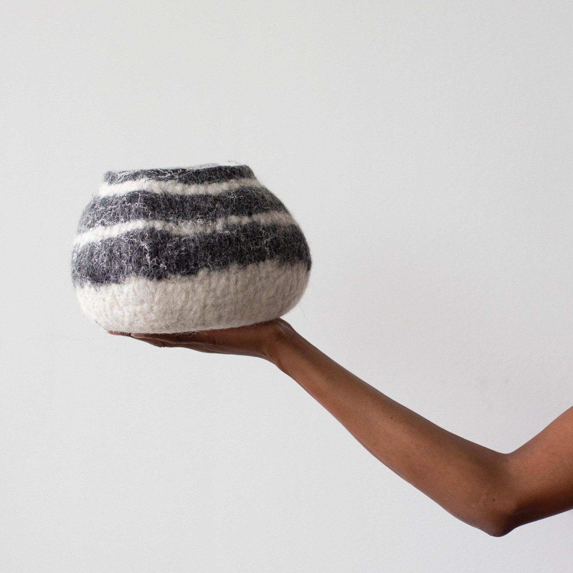 These hand-felted wool vessels will surely brighten up any space with their soft, natural texture and contemporary patterns. Perfect as an elegant little tabletop planter or a glass vase inside to fill with flowers, a plant, or succulents. These simple bowls are created by an all female artisan group in Cape Town.