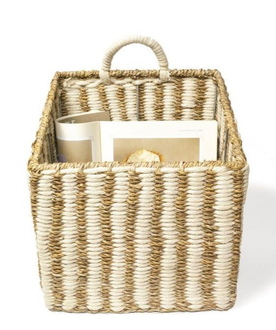 Material: Seagrass & Jute / Color: Natural / Natural & White / Size: 10.75”tall (Front) x 14.5"tall (Back) x 13”wide x 11"deep. / Due to the handcrafted nature, slight variation will occur in design, color and size. / Each product is designed and curated by Korissa, sustainably handmade by Fair Trade artisans in Bangladesh.